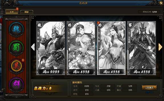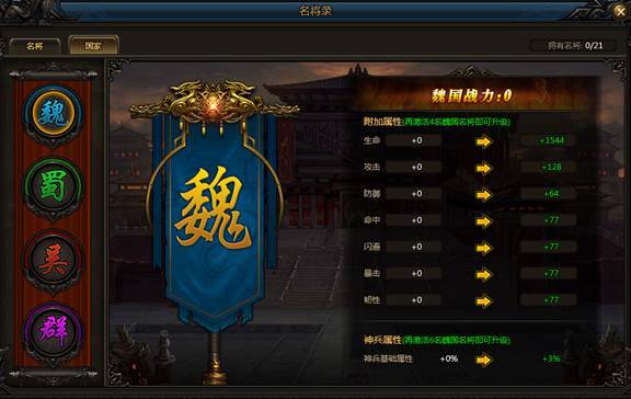 通过分别收集不同国家---魏、蜀、吴、群 四个国家,收集不同国家将领增加国家战力外,达到对应人物数量目标即可提升对应【魏-神兵、蜀-翅膀、吴-妖灵、群-法宝】四个进阶系统的属性加成!