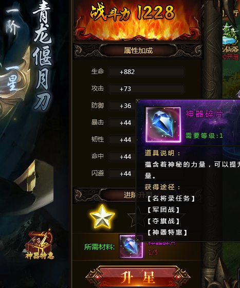 2.每种神器技能都可以通过神器碎片进行升星,每一阶段碎片需求各不相同;碎片可由各种活动获得。