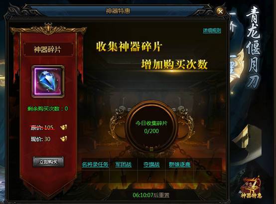 3.神器碎片可通过购买方式获得,每天可购买的量有限。(要估算好升级数量哦~)