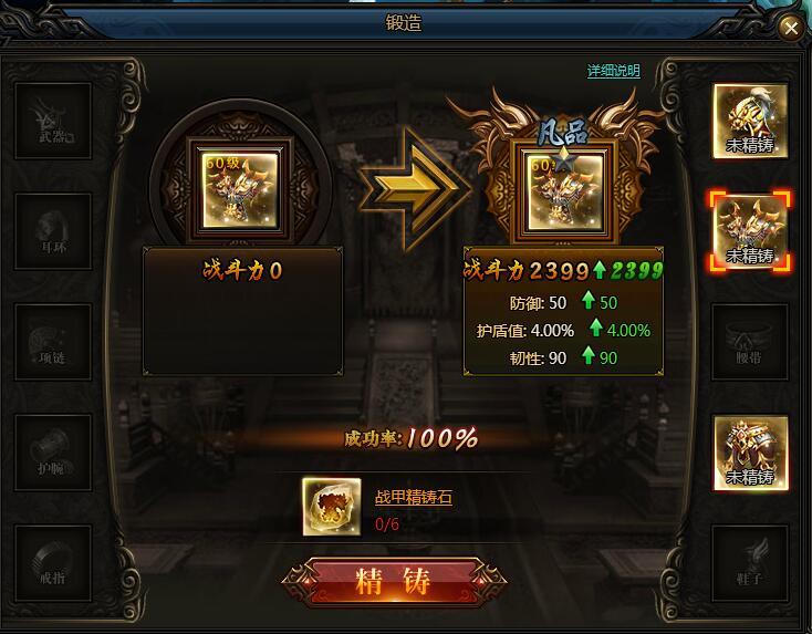 穿戴橙色或以上装备时可开启装备精铸 每个装备部位消耗不同的精铸石可对装备进行精铸 精铸可获得高级属性 高级属性 1.破盾伤害:可对目标护盾造成额外伤害 2.护盾值:可提升玩家的护盾上限 3.火攻:攻击时可对目标造成额外火系伤害 4.火防:可减免受到的火系伤害